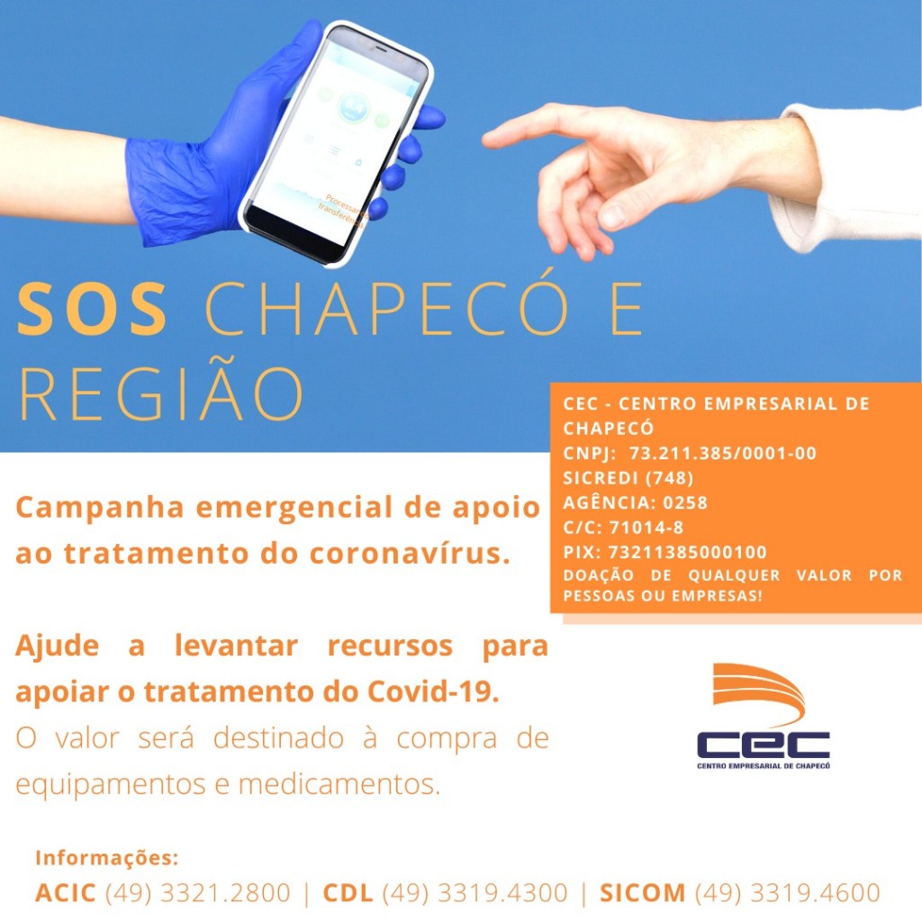 A campanha SOS CHAPECÓ E REGIÃO tem o objetivo de, em caráter emergencial, levantar recursos para apoiar o tratamento do Covid-19.